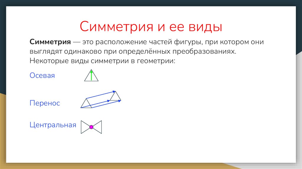 Симметрия и ее видыСимметрия — это расположение частей фигуры, при котором они