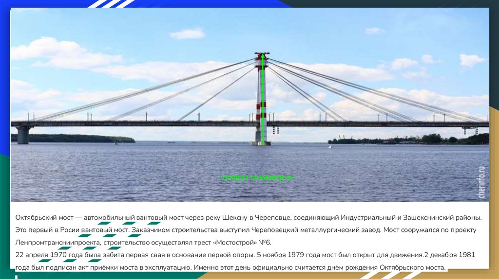 осевая симметрияОктябрьский мост — автомобильный вантовый мост через реку Шексну в Череповце, соединяющий Индустриальный и Зашекснинский районы.