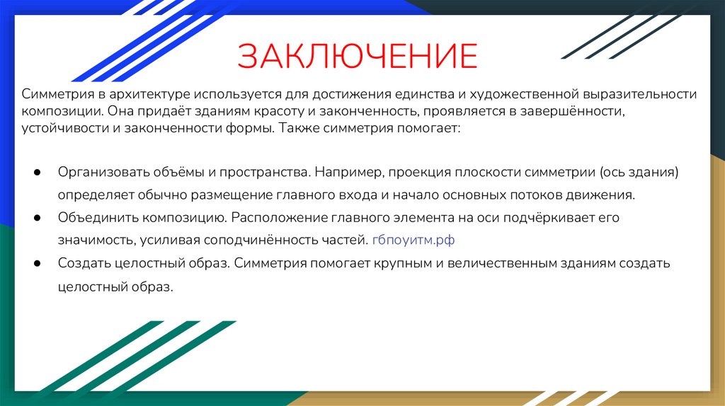 ЗАКЛЮЧЕНИЕСимметрия в архитектуре используется для достижения единства и художественной выразительности