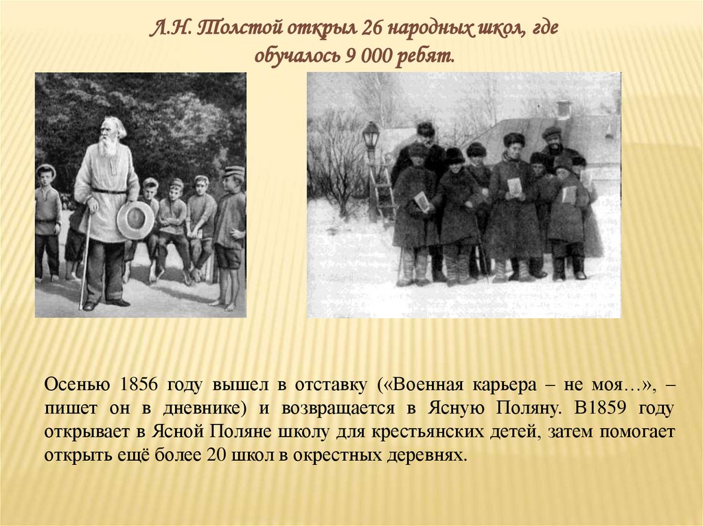 Л.Н. Толстой открыл 26 народных школ, гдеобучалось 9 000 ребят.