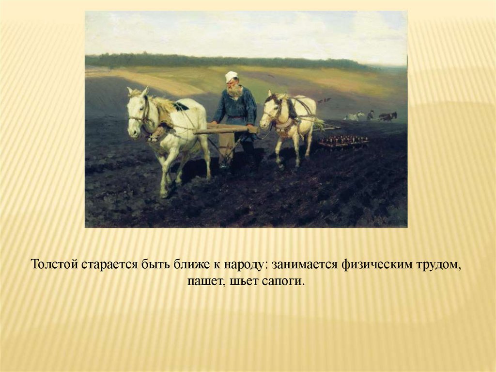 Толстой старается быть ближе к народу: занимается физическим трудом,пашет, шьет сапоги.