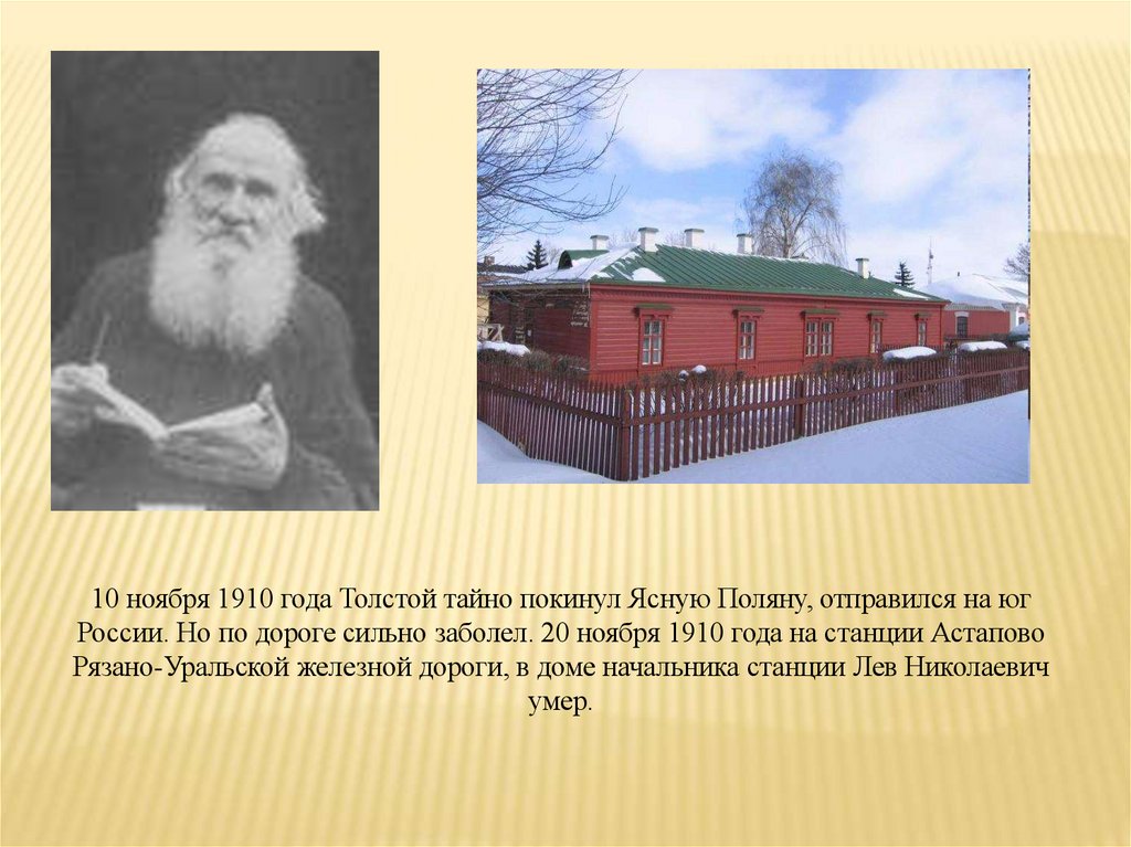 10 ноября 1910 года Толстой тайно покинул Ясную Поляну, отправился на югРоссии. Но по дороге сильно заболел. 20 ноября 1910 года на станции Астапово