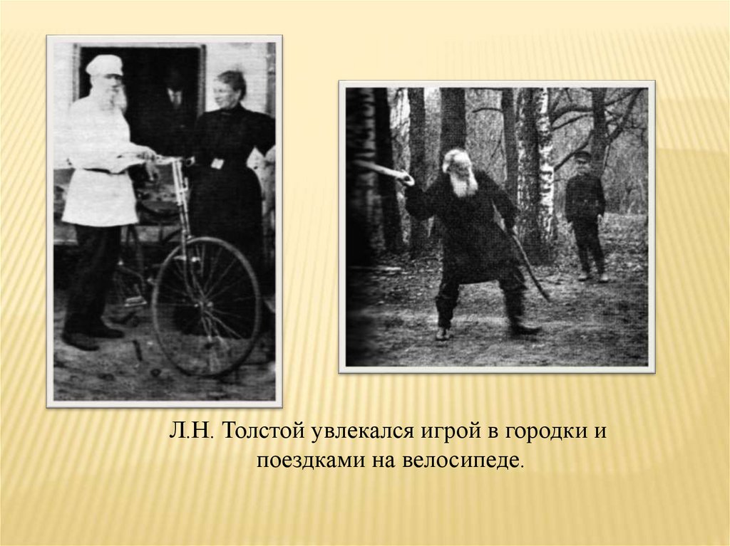 Л.Н. Толстой увлекался игрой в городки ипоездками на велосипеде.