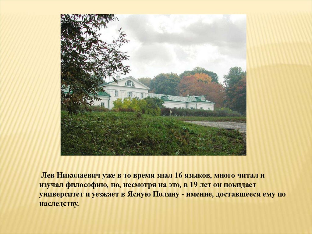 университет и уезжает в Ясную Поляну - имение, доставшееся ему по