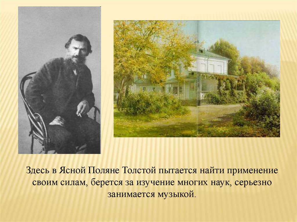 Здесь в Ясной Поляне Толстой пытается найти применениесвоим силам, берется за изучение многих наук, серьезно