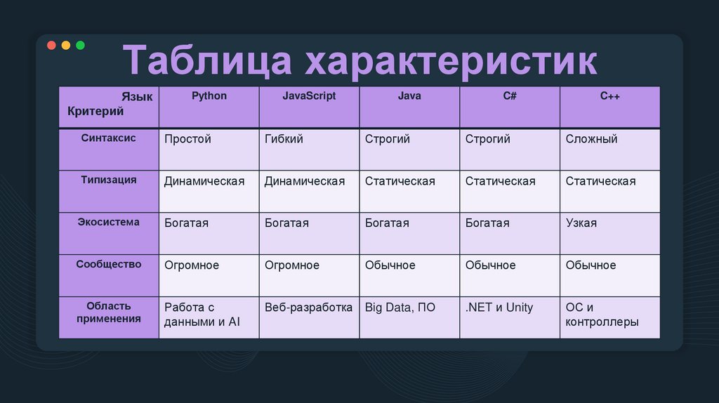 ● Синтаксис — простота изучения, написания и читаемости кода.● Типизация — статическая/динамическая.