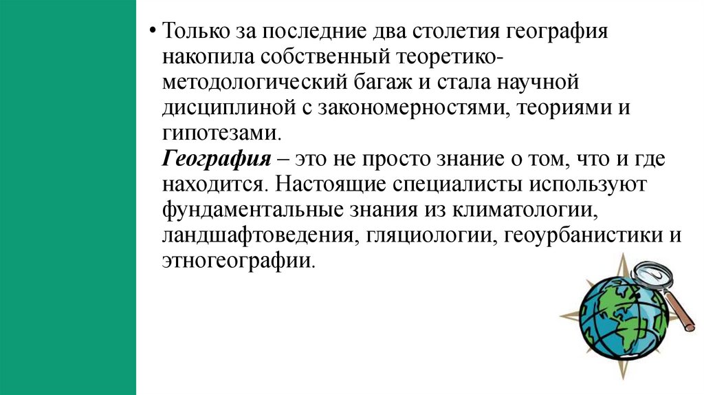 • Только за последние два столетия географиянакопила собственный теоретикометодологический багаж и стала научной