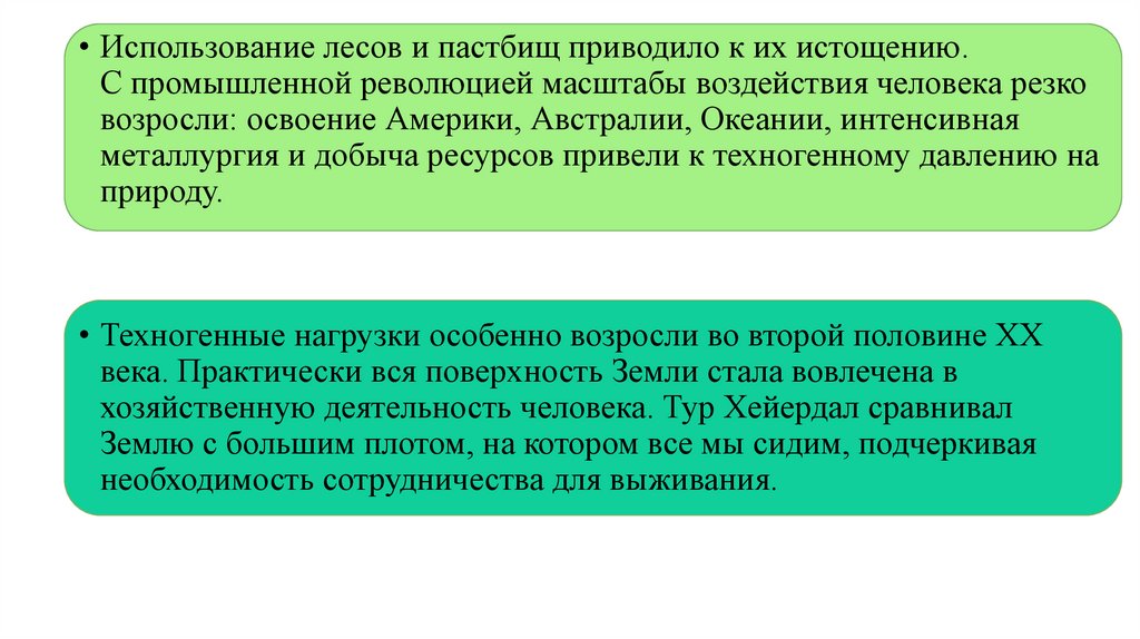 • Использование лесов и пастбищ приводило к их истощению.С промышленной революцией масштабы воздействия человека резко