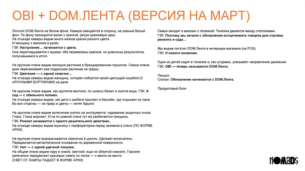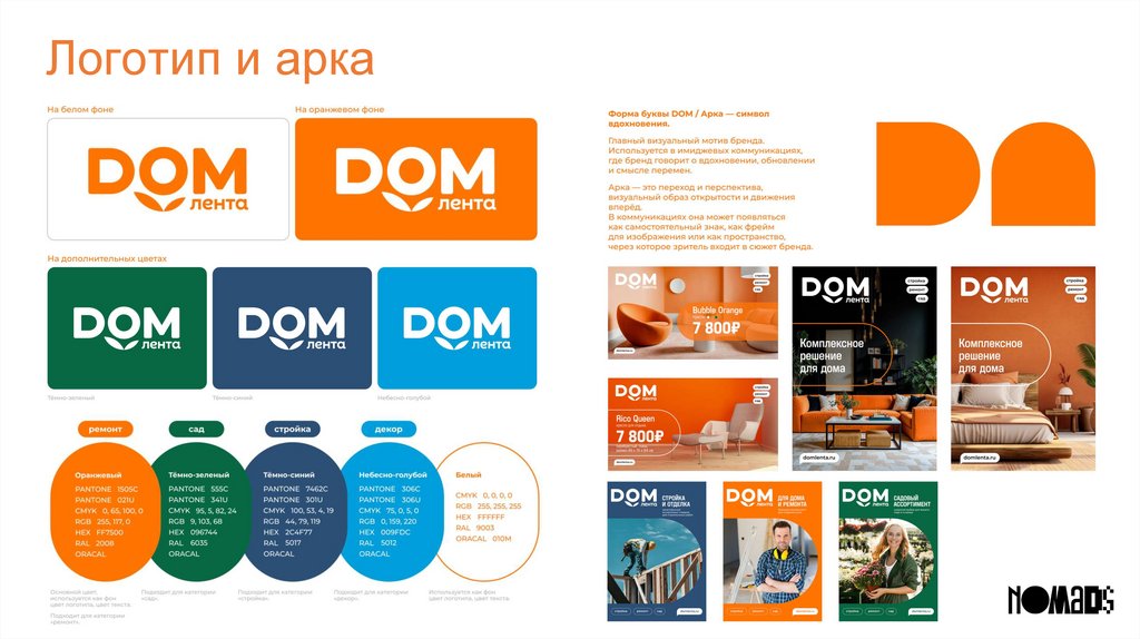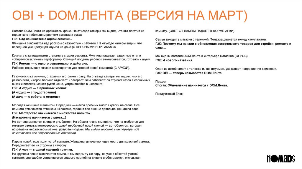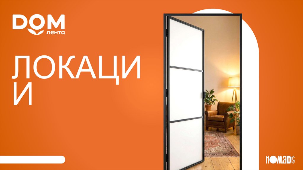 OBI + DOM.ЛЕНТА (ВЕРСИЯ НА МАРТ)Логотип DOM.Лента на оранжевом фоне. На отъезде камеры мы видим, что это логотип на