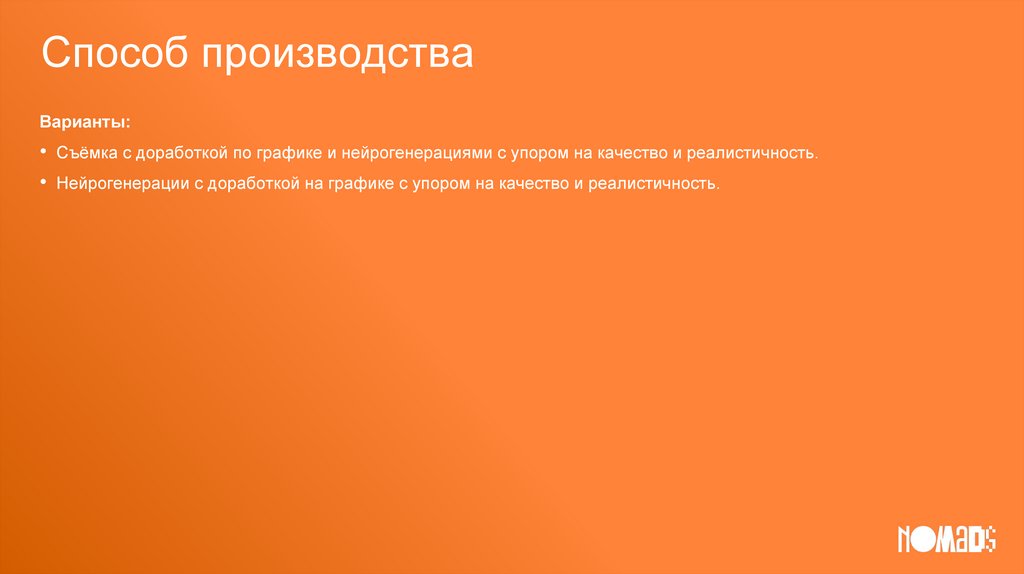 • Съёмка с доработкой по графике и нейрогенерациями с упором на качество и реалистичность.