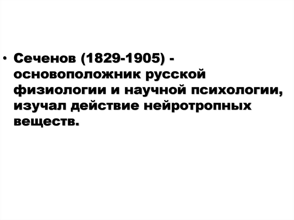 • Сеченов (1829-1905) основоположник русскойфизиологии и научной психологии,