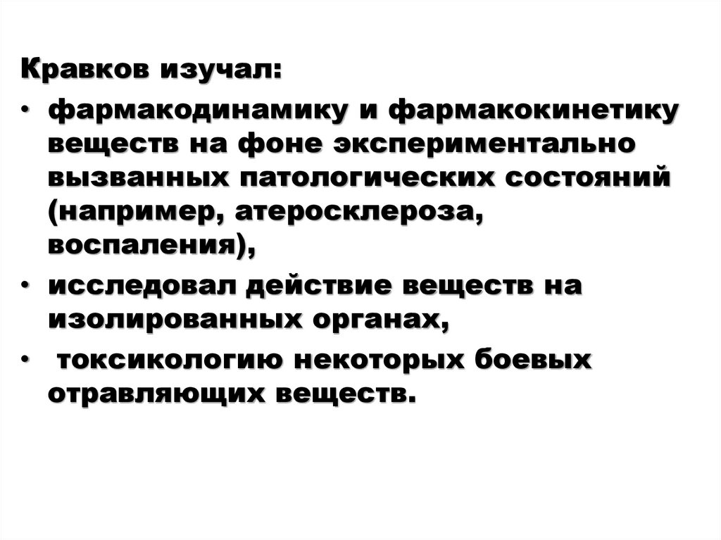 Кравков изучал:• фармакодинамику и фармакокинетику