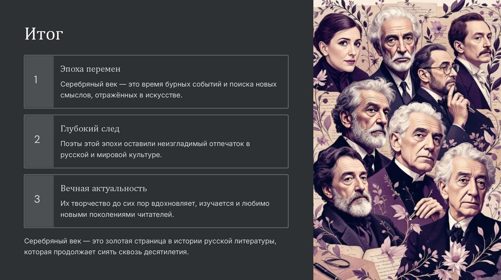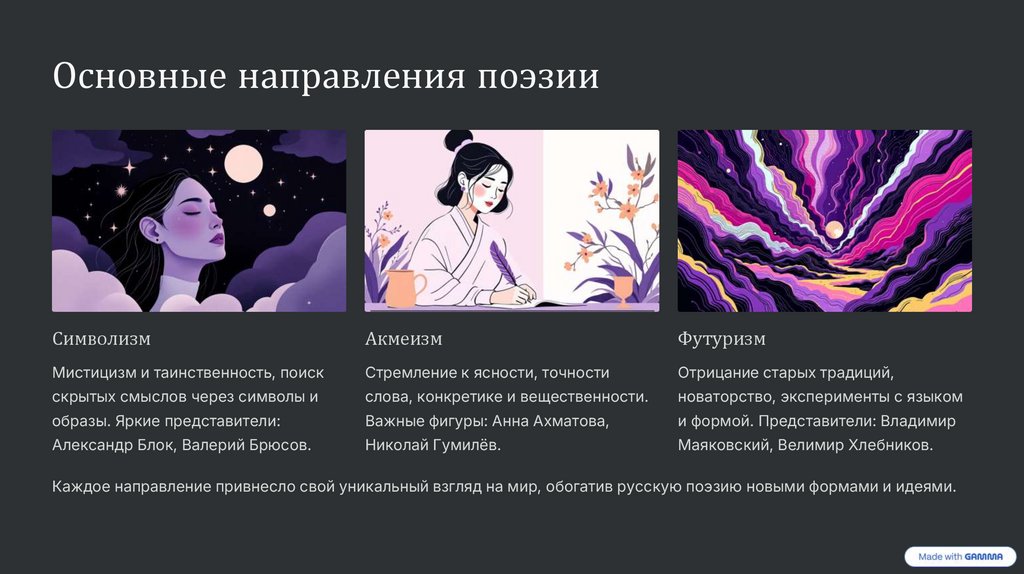 Каждое направление привнесло свой уникальный взгляд на мир, обогатив русскую поэзию новыми формами и идеями.