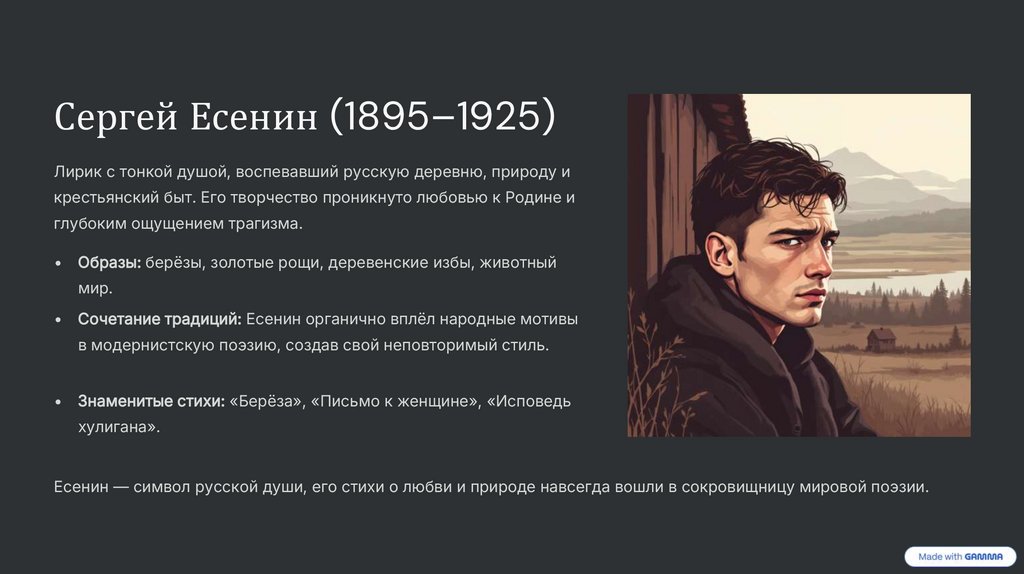 Есенин — символ русской души, его стихи о любви и природе навсегда вошли в сокровищницу мировой поэзии.