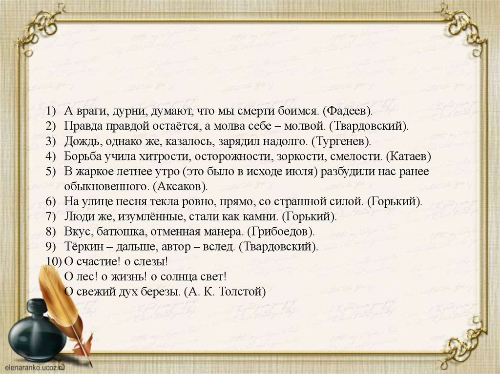 1) А враги, дурни, думают, что мы смерти боимся. (Фадеев).2) Правда правдой остаётся, а молва себе – молвой. (Твардовский).