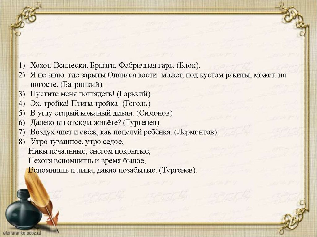 1) Хохот. Всплески. Брызги. Фабричная гарь. (Блок).2) Я не знаю, где зарыты Опанаса кости: может, под кустом ракиты, может, на