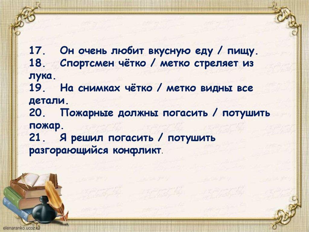17. Он очень любит вкусную еду / пищу.18. Спортсмен чётко / метко стреляет из