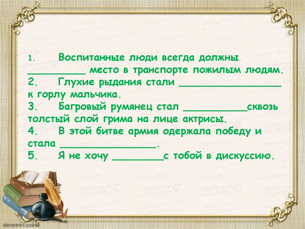 Воспитанные люди всегда должны_________ место в транспорте пожилым людям.