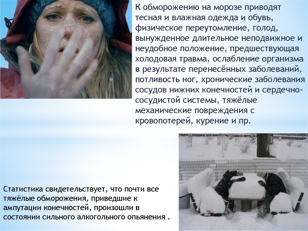 при обморожении: высокая влажность воздуха, отсыревшая одежда,