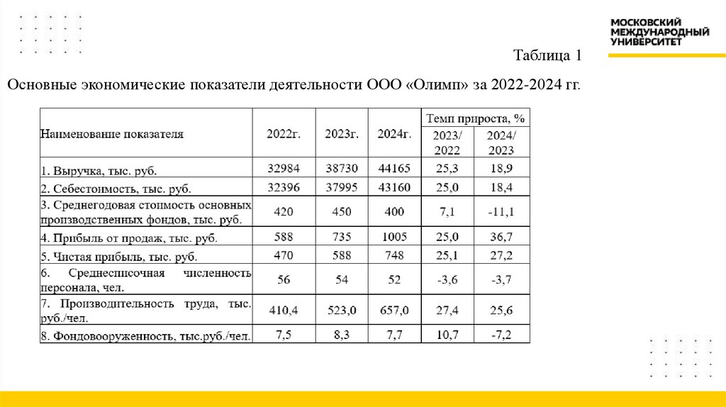 Таблица 1Основные экономические показатели деятельности ООО «Олимп» за 2022-2024 гг.