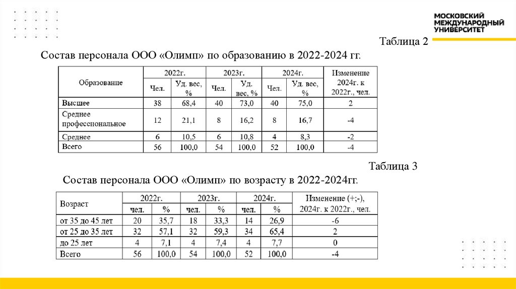 Таблица 2Состав персонала ООО «Олимп» по образованию в 2022-2024 гг.