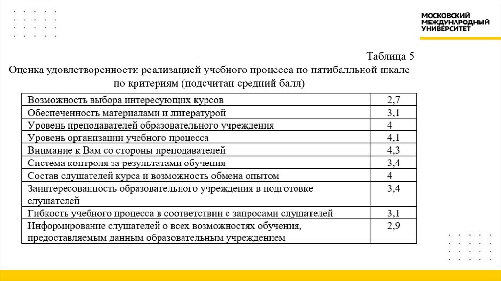 Таблица 5Оценка удовлетворенности реализацией учебного процесса по пятибалльной шкале