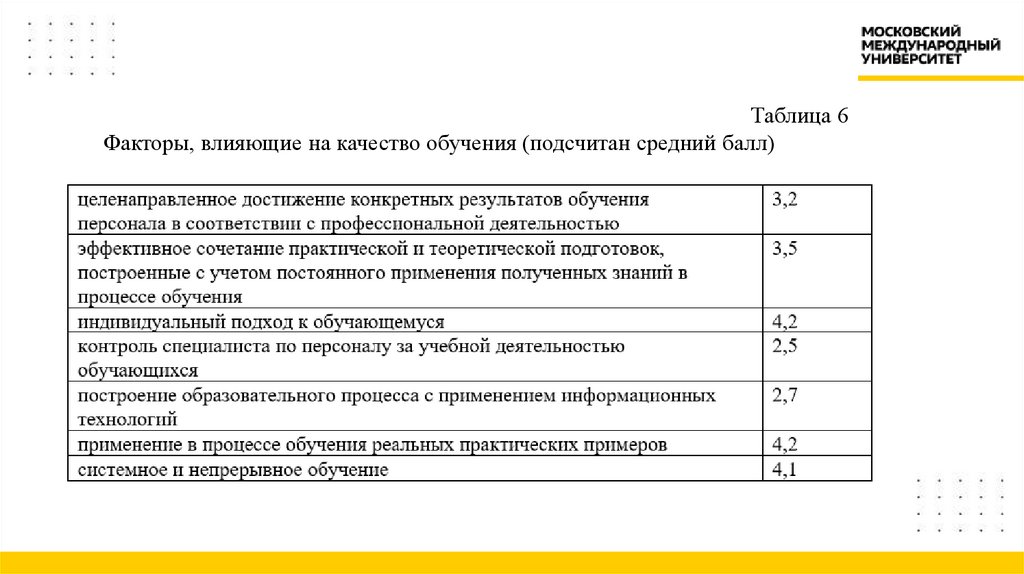 Таблица 6Факторы, влияющие на качество обучения (подсчитан средний балл)