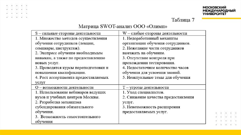 Таблица 7Матрица SWOT-анализ ООО «Олимп»