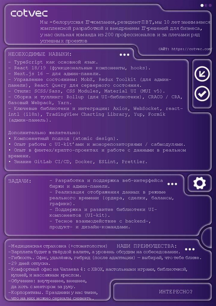 - Поддержка и развитие библиотеки UIкомпонентов (UI-kit).