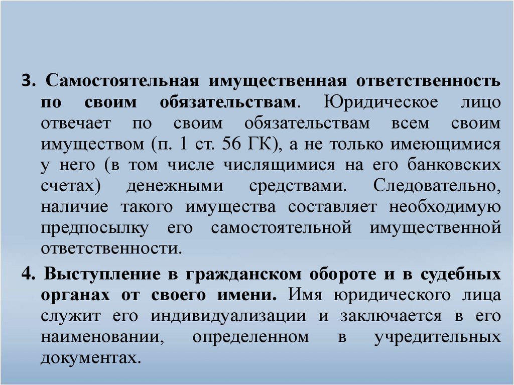 3. Самостоятельная имущественная ответственностьпо своим обязательствам. Юридическое лицо