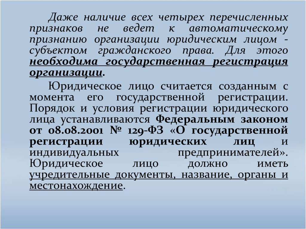 признанию организации юридическим лицом субъектом гражданского права. Для этого