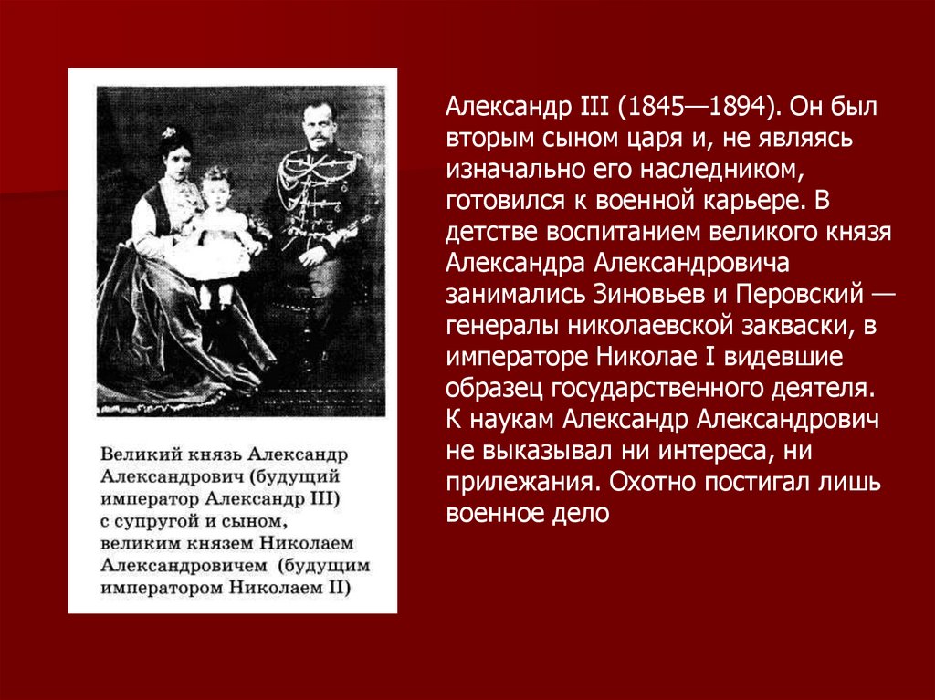 Александр III (1845—1894). Он былвторым сыном царя и, не являясь