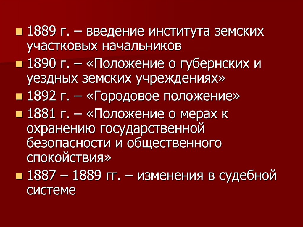 1889 г. – введение института земскихучастковых начальников
