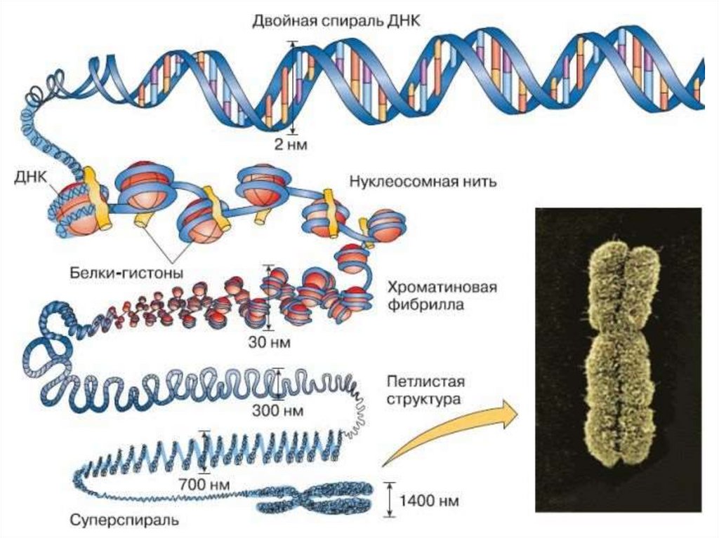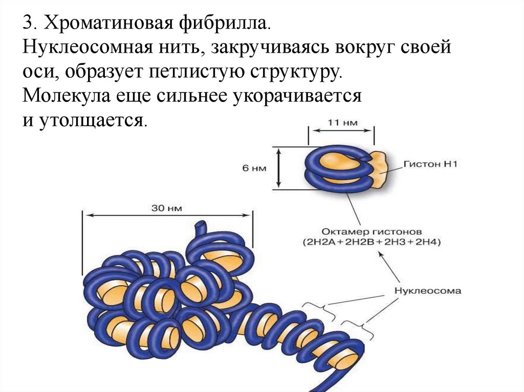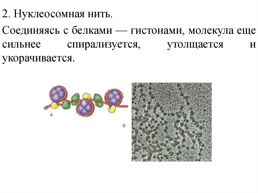 2. Нуклеосомная нить.Соединяясь с белками — гистонами, молекула еще