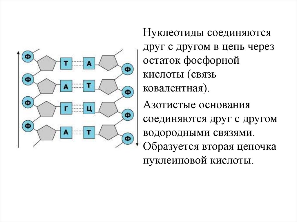 Нуклеотиды в двух цепях располагаются комплементарно друг