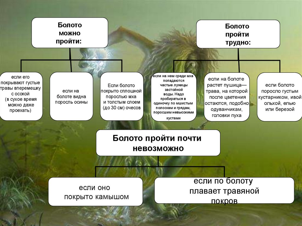 3) Непроходимы или труднопроходимы. 3) Если растет один мох – опасны.