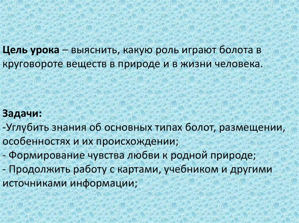 -Углубить знания об основных типах болот, размещении,