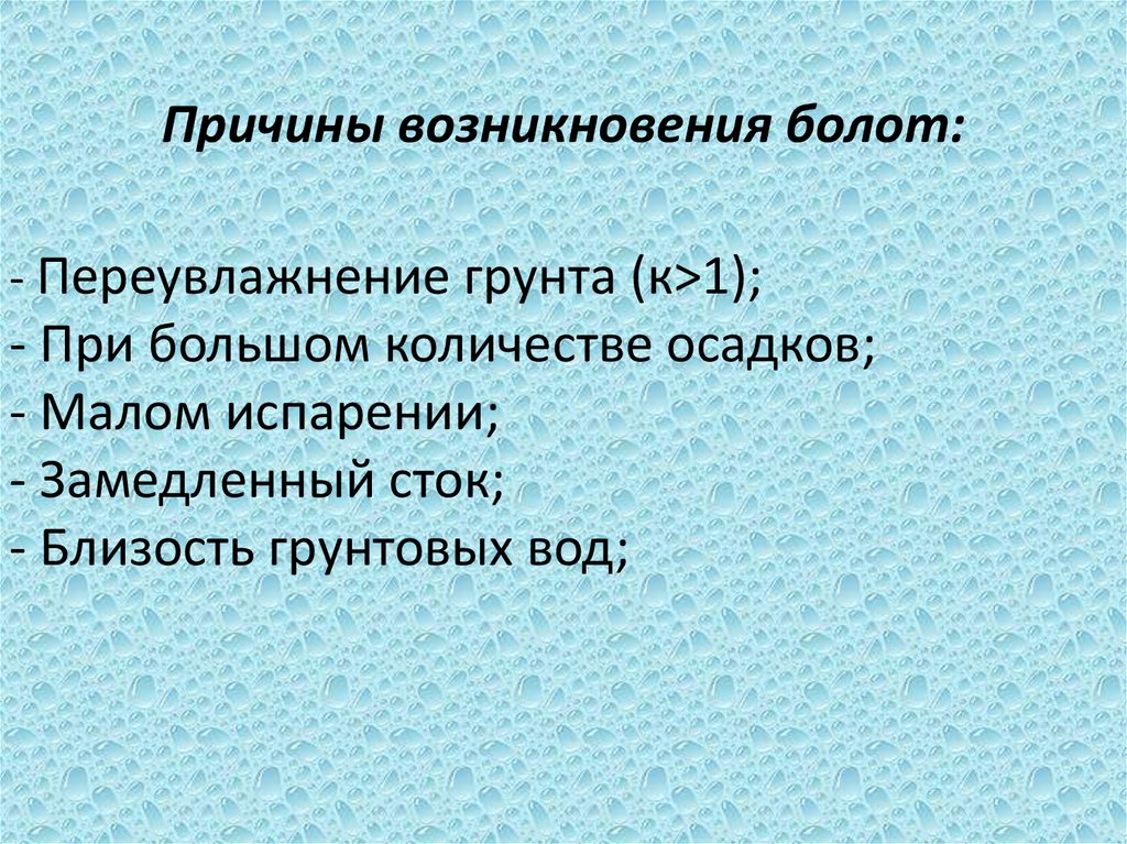 Причины возникновения болот:- Переувлажнение грунта (к>1);