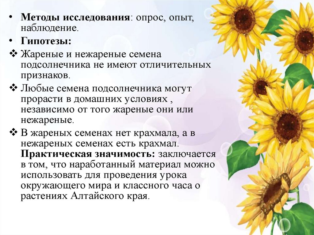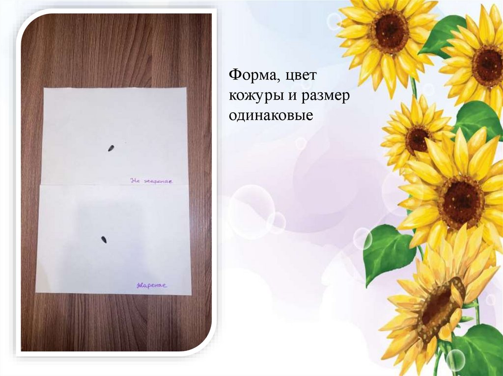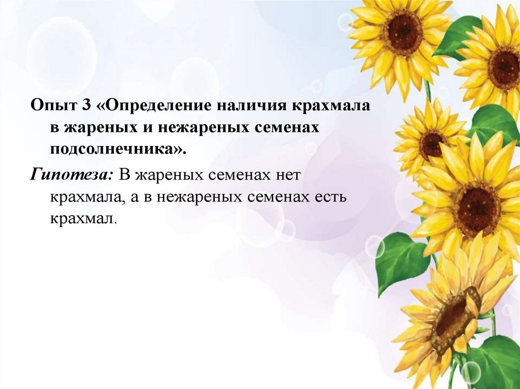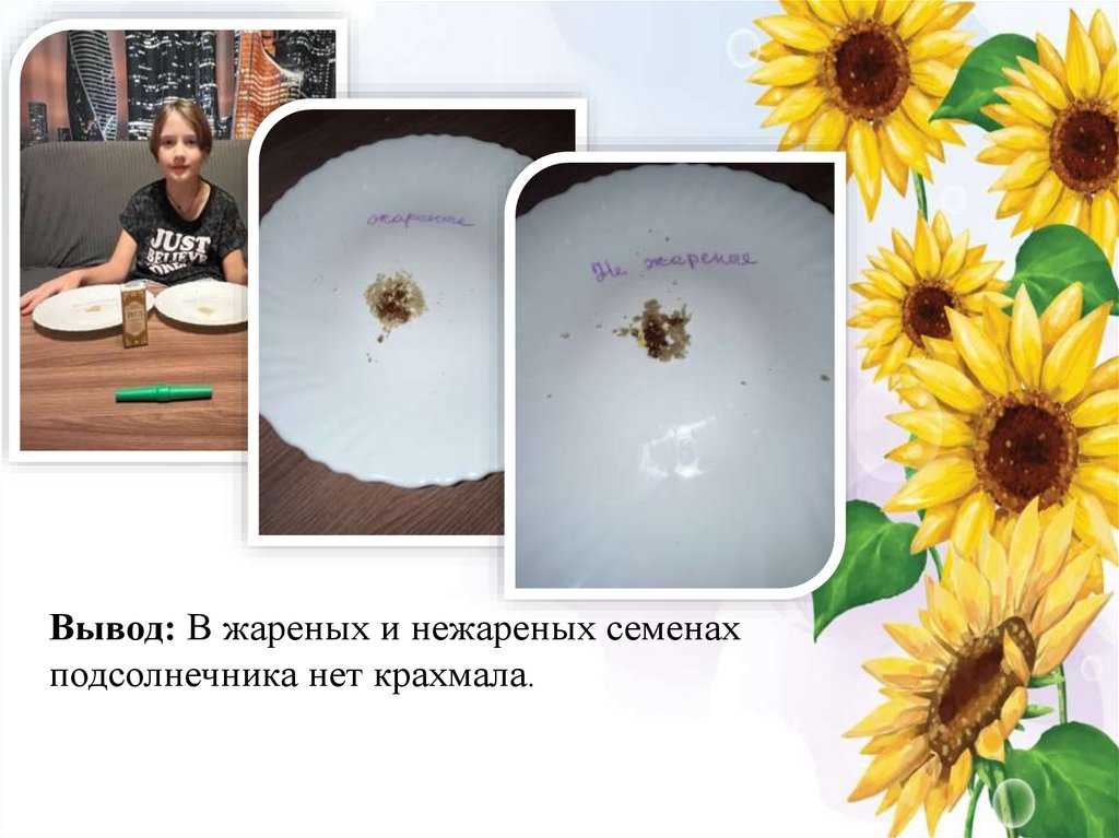 Вывод: В жареных и нежареных семенахподсолнечника нет крахмала.