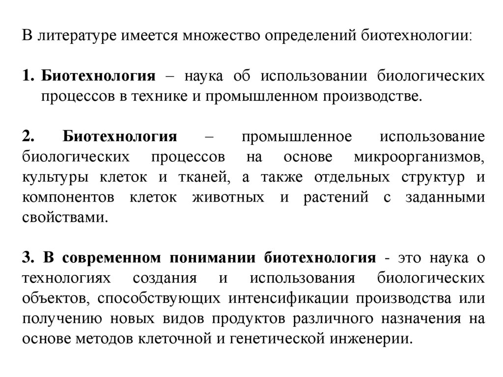 В литературе имеется множество определений биотехнологии:1. Биотехнология – наука об использовании биологических