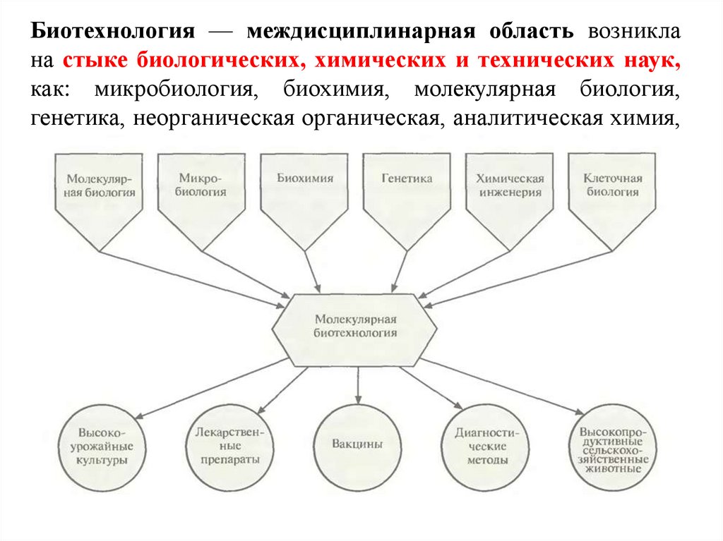 Биотехнология — междисциплинарная область возниклана стыке биологических, химических и технических наук,