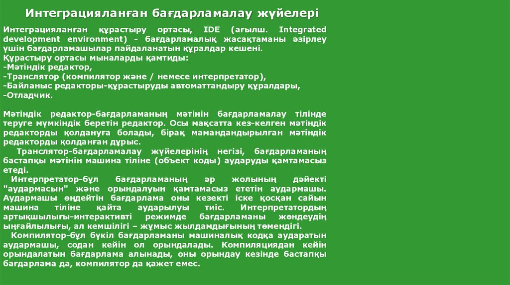 Компилятор-бұл бүкіл бағдарламаны машиналық кодқа аударатын
