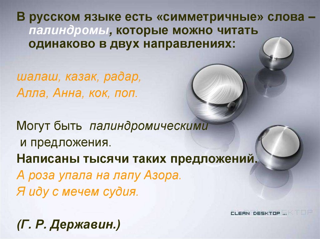 В русском языке есть «симметричные» слова –палиндромы, которые можно читать