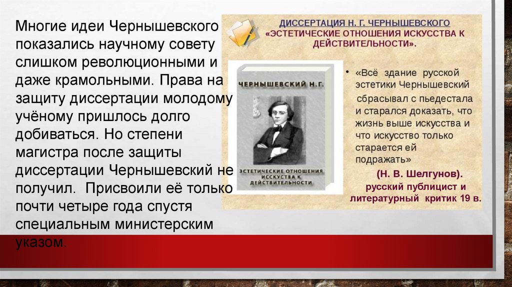 ДИССЕРТАЦИЯ• В 1855 году Чернышевский представил к