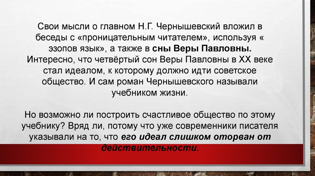 Чернышевский явно идеализирует завтрашний день. Именно поэтому роман
