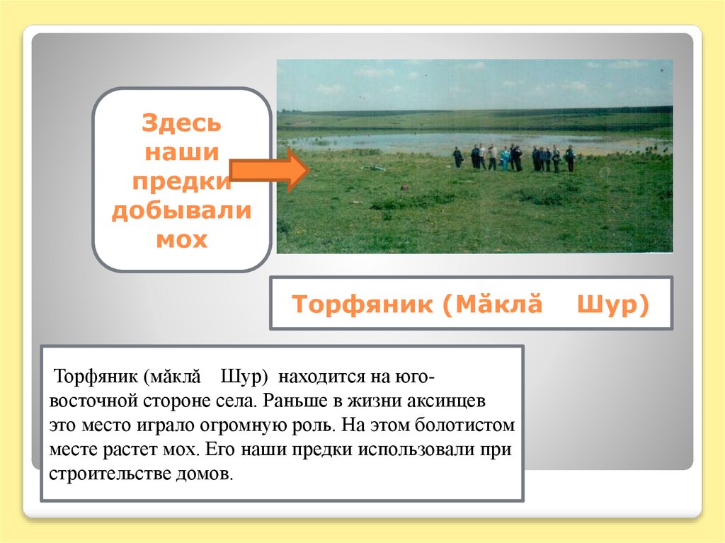 Торфяник (мăклă Шур) находится на юговосточной стороне села. Раньше в жизни аксинцев