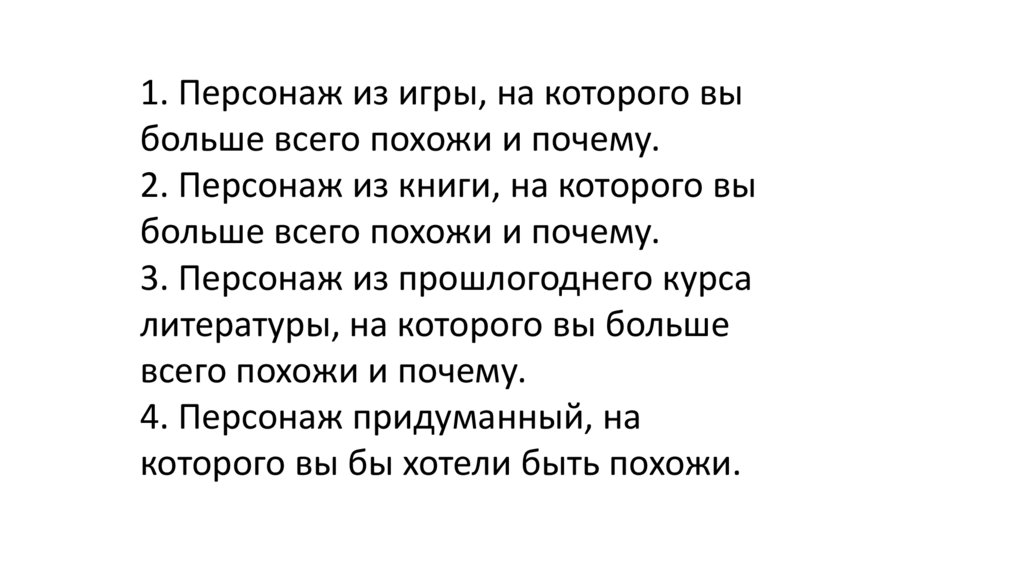 1. Персонаж из игры, на которого выбольше всего похожи и почему.