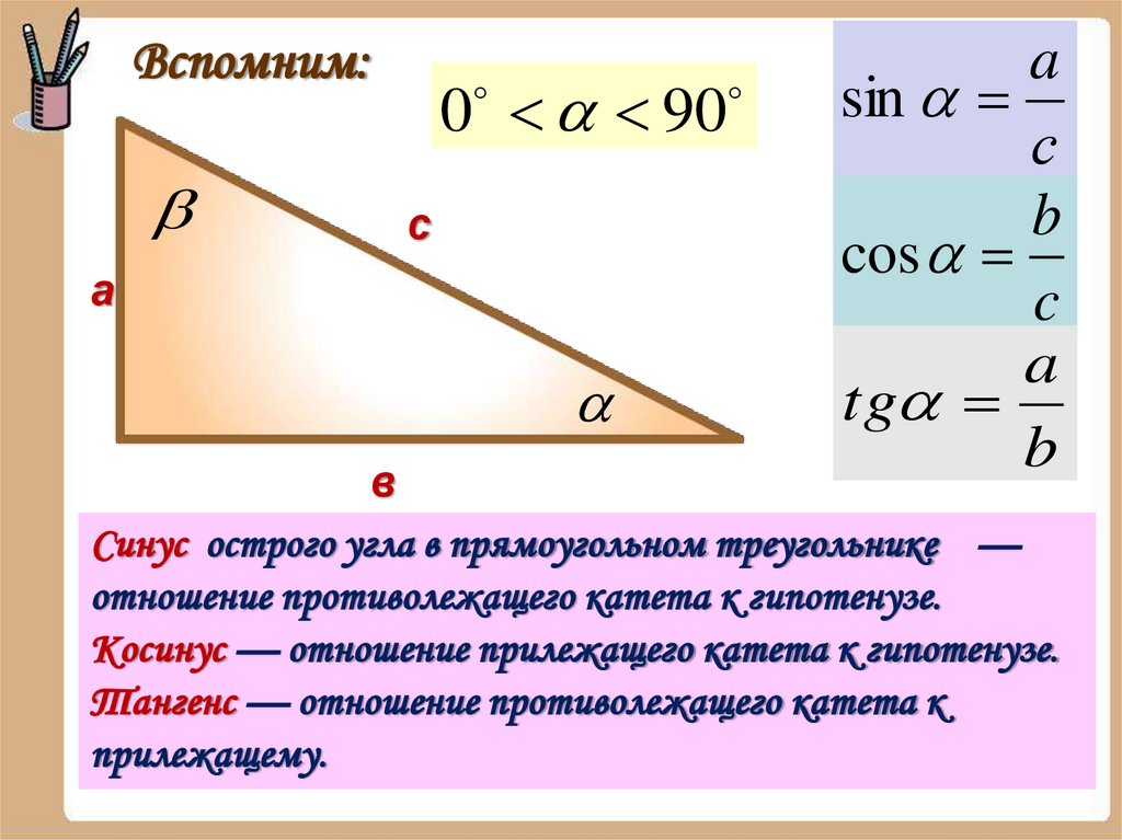 Косинус — отношение прилежащего катета к гипотенузе.