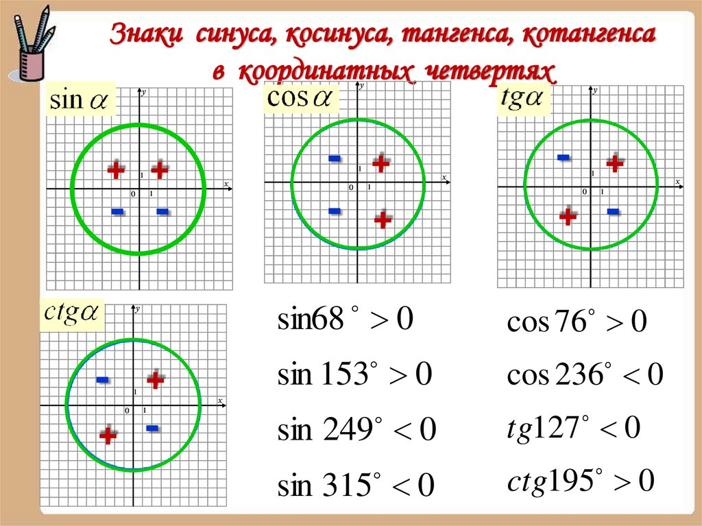 Знаки синуса, косинуса, тангенса, котангенсав координатных четвертях