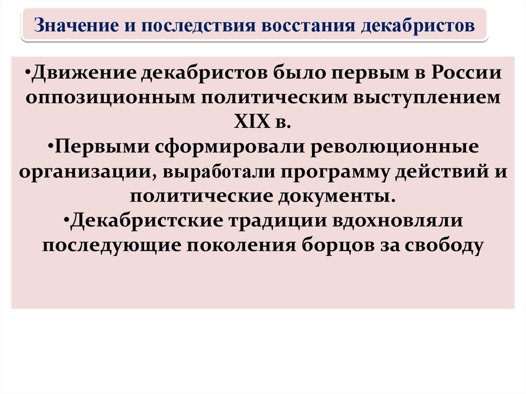 Значение и последствия восстания декабристов•Движение декабристов было первым в России